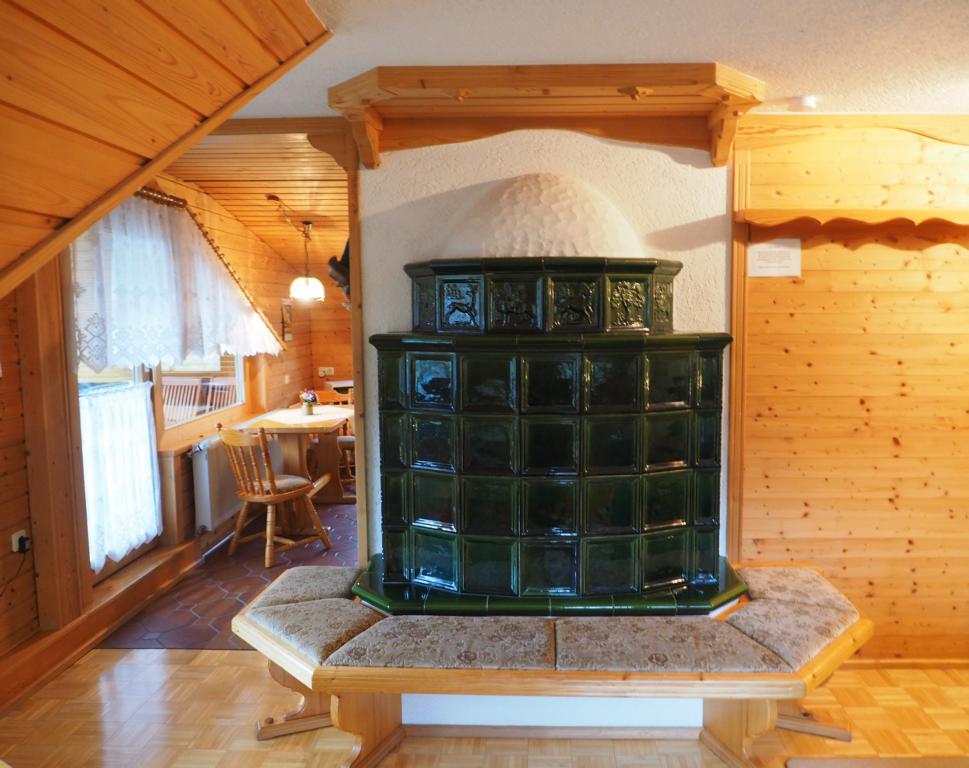 In einem angenehm großen Wohnzimmer, in dem sich ein rustikaler Kachelofen befindet, werden auch längere Aufenthalte nicht langweilig. Ein besonderes Highlight dieser Ferienwohnung ist der herrliche Rundumblick auf die Berge.